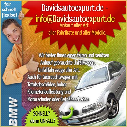 ----- Wenn Sie Wert auf einen zuverlässigen und seriösen Ansprechpartner im Bereich des Fahrzeugankaufs legen, dann sind Sie bei uns richtig. Wir kaufen gepflegte Gebrauchtwagen, Fahrzeuge mit Unfall-, Motor-, und Getriebeschäden. Durch unsere langjährige Erfahrung sind wir in der Lage realistische am Markt orientierte Preise zu zahlen. Bei uns gibt es auch keine “letzte-Preis-Gespräche” sondern fundierte und konkrete Angebote für Ihr Fahrzeug. Ihr Fahrzeugangebot an uns ist für Sie kostenlos und unverbindlich. Kontakt: Tel: 0162-7671823 od. 02307-281571- Bundesweiter Ankauf - www.davids-gebrauchtwagen-ankauf.de - info@davids-gebrauchtwagen-ankauf.de - Mo bis So 24 Stunden erreichbar.