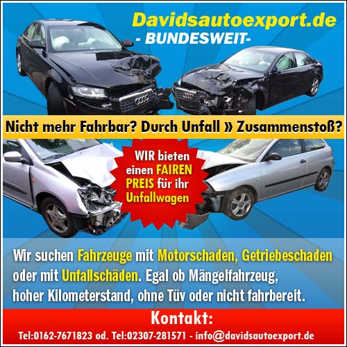 ----- Wenn Sie Wert auf einen zuverlässigen und seriösen Ansprechpartner im Bereich des Fahrzeugankaufs legen, dann sind Sie bei uns richtig. Wir kaufen gepflegte Gebrauchtwagen, Fahrzeuge mit Unfall-, Motor-, und Getriebeschäden. Durch unsere langjährige Erfahrung sind wir in der Lage realistische am Markt orientierte Preise zu zahlen. Bei uns gibt es auch keine “letzte-Preis-Gespräche” sondern fundierte und konkrete Angebote für Ihr Fahrzeug. Ihr Fahrzeugangebot an uns ist für Sie kostenlos und unverbindlich. Kontakt: Tel: 0162-7671823 od. 02307-281571- Bundesweiter Ankauf - www.davids-gebrauchtwagen-ankauf.de - info@davids-gebrauchtwagen-ankauf.de - Mo bis So 24 Stunden erreichbar.