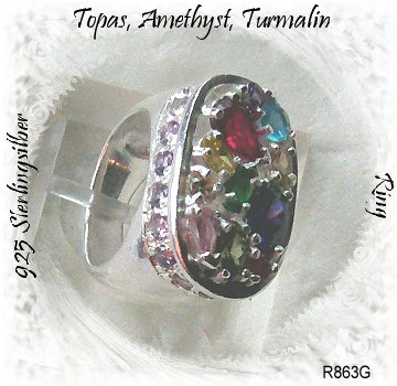 Granat, der Turmalin und der Topas. Der äußere untere Rand bei dem Ring ist rundum mit Amethysten versehen. Die Steine sind allesamt facettiert. Der Ring ist nur in Ringgröße 16,5 mm vorhanden. Infos auf der Web Site Hamsterkammer bei Ringen.
