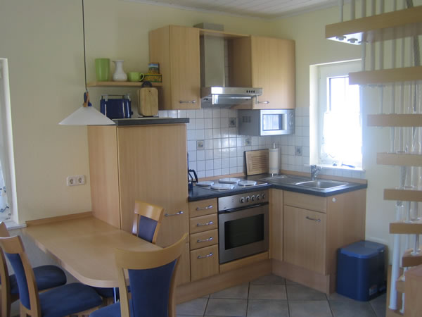 Küche: komplett eingerichtete Küchenzeile, 4-Platten-Herd/Backofen, Mikrowelle, Kühlschrank mit Tiefkühlfach, Kaffeemaschine, Wasserkocher, Toaster, Dunstabzugshaube, Mixer