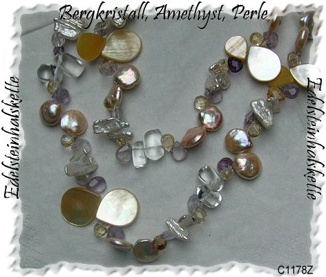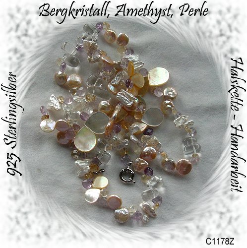 auffallend schönes Collier aus Silber 925/- mit großem Federringverschluß. Die Steine sind abwechselnd aufgefädelt und bestehen aus facettiertem Bergkristall, Amethyst und Citrin sowie wunderschön schimmernden Perlmuttplatten in Tropfenform und echten Süßwasserperlen in länglicher und Linsen-Form. Länge: ca. 90 cm Breite: ca. 20 mm Die Kette kann unterschiedlich, 1 und 2 reihig getragen werden. ) Artikel Nr. C1178Z, € 49,50) Für weitere Infos klicken Sie den Link http://www.immotor.de an. Impressum: Karin Pauls, Lehmkuhle 9, 27389 Stemmen